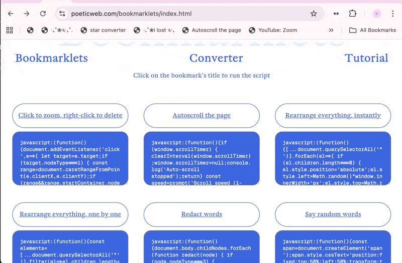 We are essentially treating our browser's bookmarks bar as an instrument, with the different bookmarklets as little things we can strum.